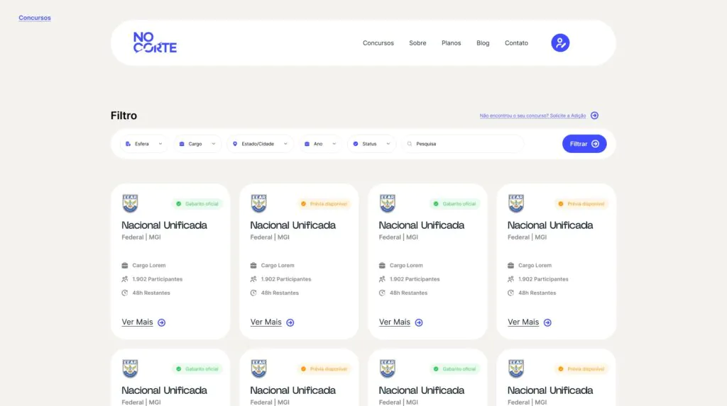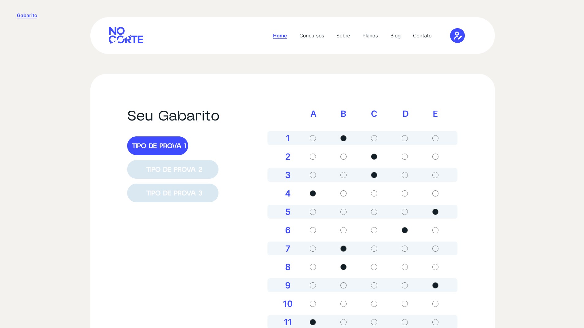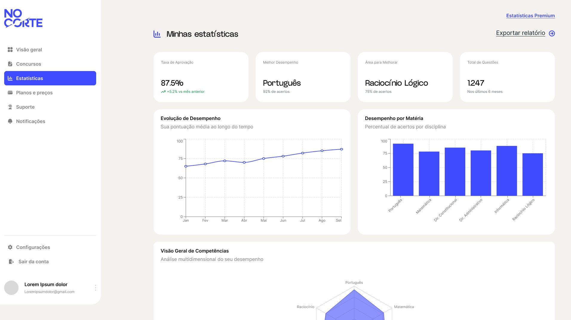 O NoCorte é uma plataforma inteligente criada para transformar dados em clareza. Voltada a candidatos de concursos públicos, ela permite lançar o gabarito de provas, acompanhar estatísticas em tempo real e comparar o próprio desempenho com milhares de outros usuários — tudo em um só lugar, de forma simples e visual.