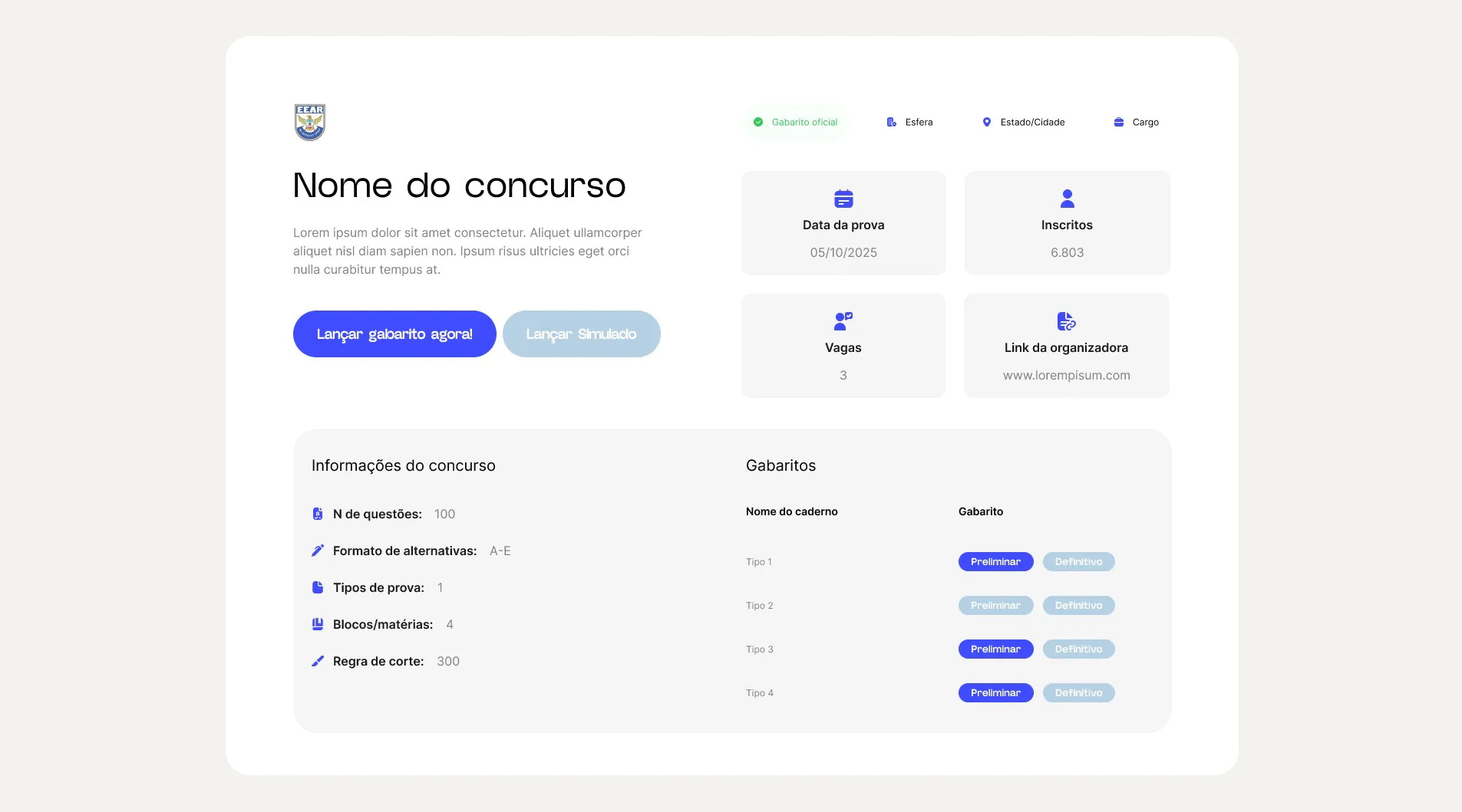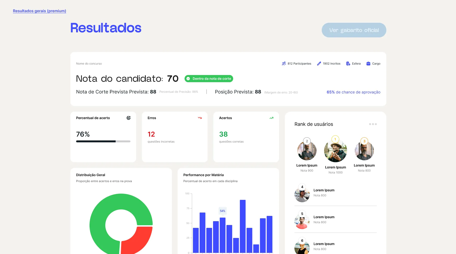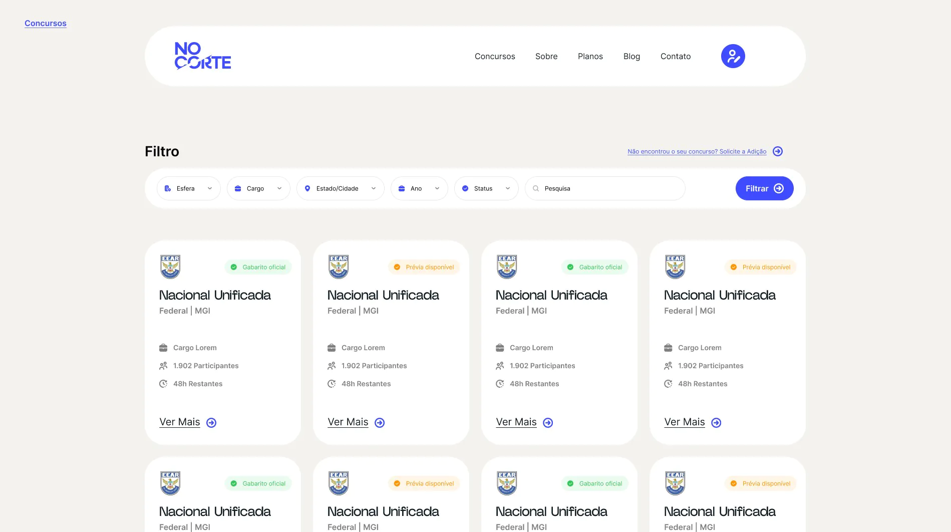 O NoCorte é uma plataforma inteligente criada para transformar dados em clareza. Voltada a candidatos de concursos públicos, ela permite lançar o gabarito de provas, acompanhar estatísticas em tempo real e comparar o próprio desempenho com milhares de outros usuários — tudo em um só lugar, de forma simples e visual.