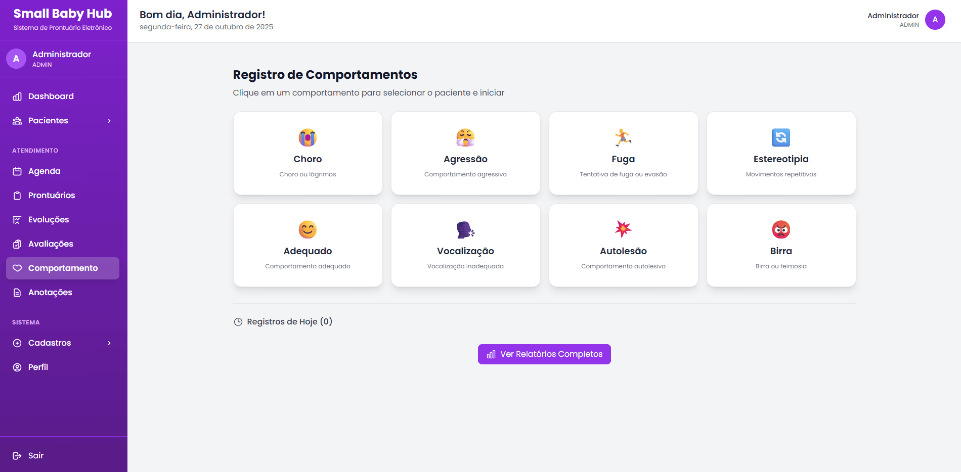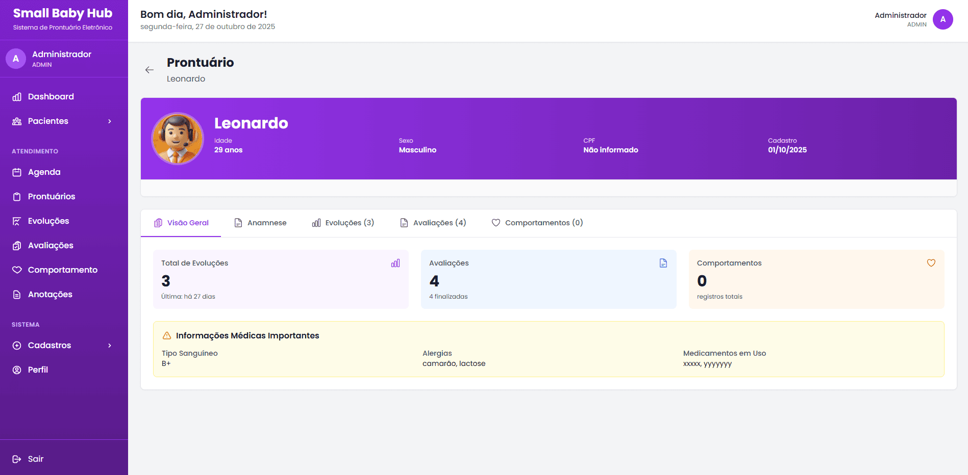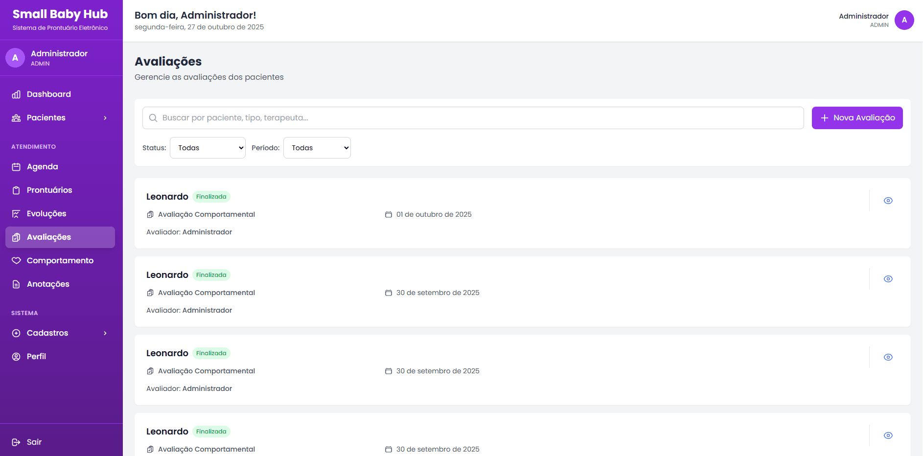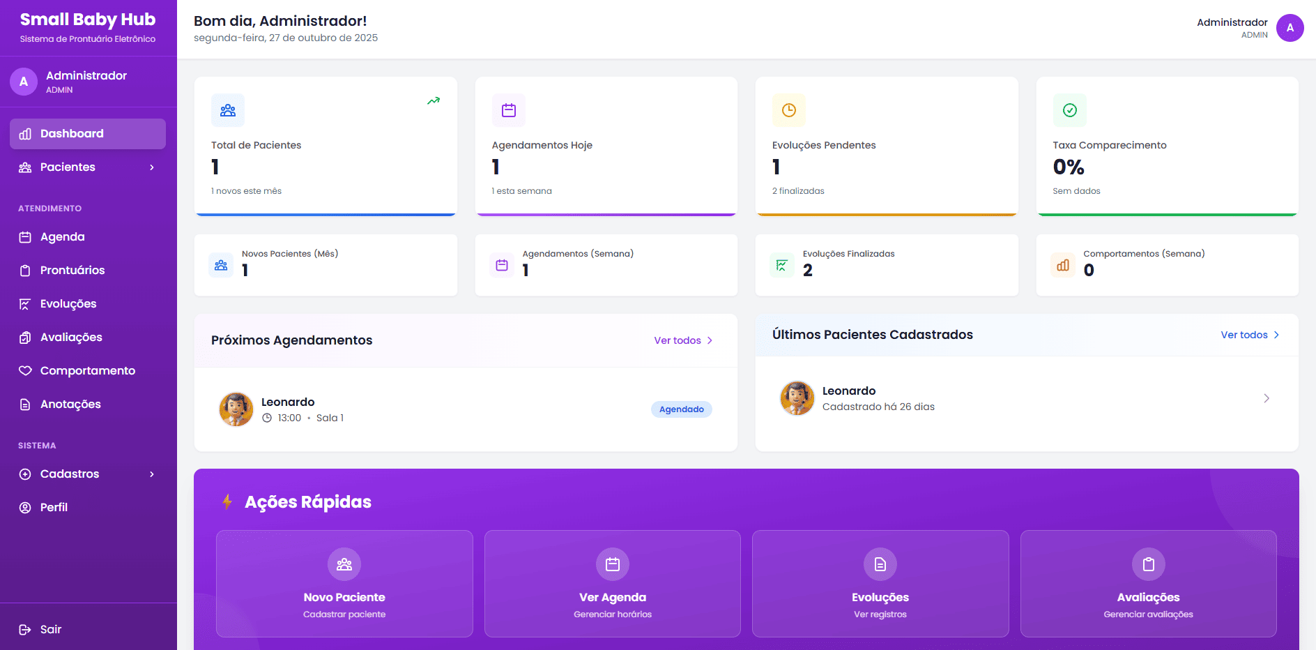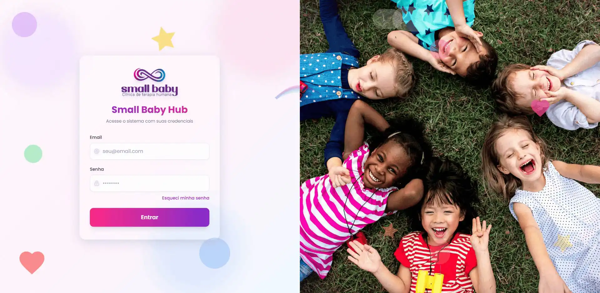 O SmallBaby Hub é um sistema desenvolvido sob medida para a Small Baby, clínica especializada em terapias e desenvolvimento infantil. Criamos uma plataforma completa para gestão clínica pediátrica, com prontuário eletrônico, controle de atendimentos e avaliações padronizadas, garantindo mais organização, eficiência e clareza no acompanhamento dos pacientes.