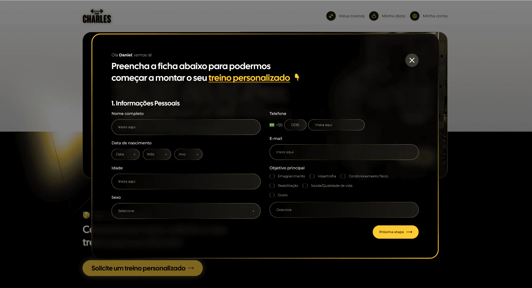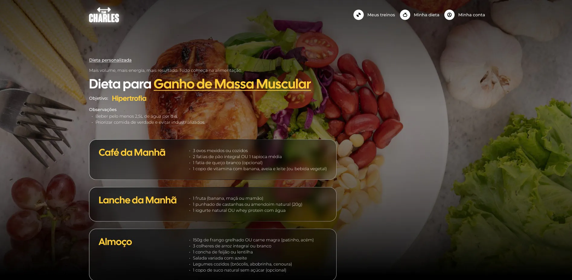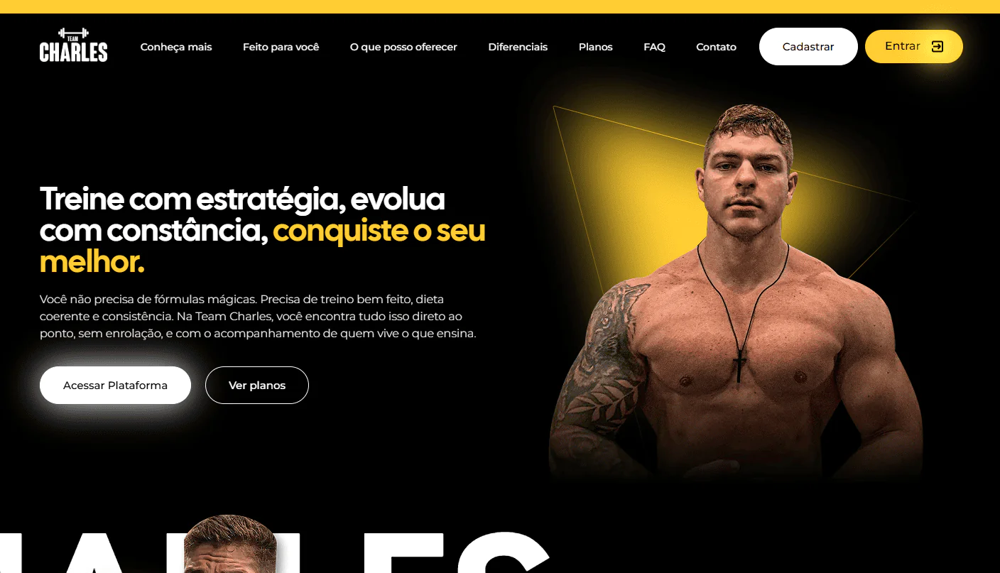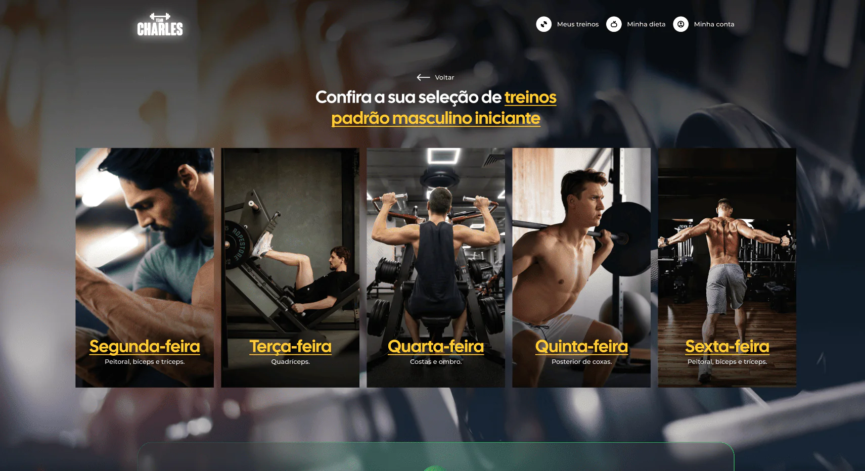 Desenvolvemos a plataforma Team Charles, criada para oferecer aos alunos uma experiência completa de acompanhamento de treinos e evolução física. O sistema foi pensado para ser simples, envolvente e eficiente, garantindo que cada aluno tenha um plano de treinos, atualizado e acessível de qualquer dispositivo.